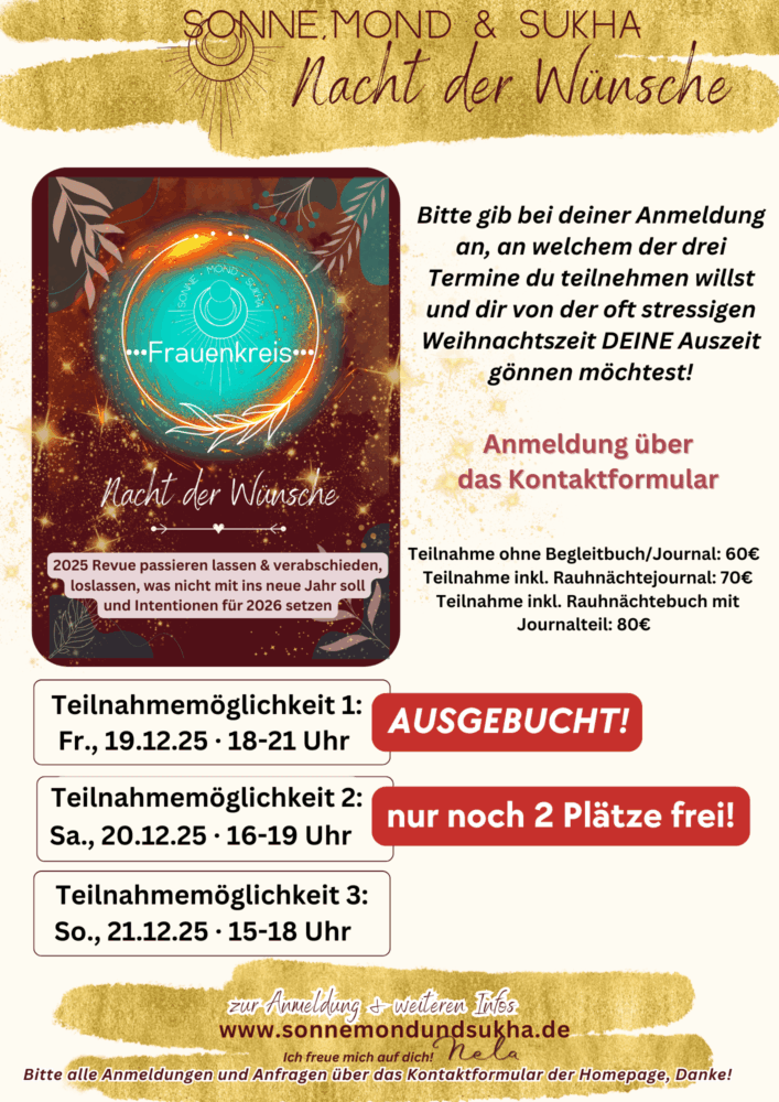 Komm gerne mit deinem Wunschtermin über das Kontaktformular auf mich zu. Du findest auf allen Unterseiten zu jedem Angebot alle Infos und Preise – und du kannst hier immer wieder auch ausgeschriebene öffentliche Angebote finden und dich hierfür einbuchen.